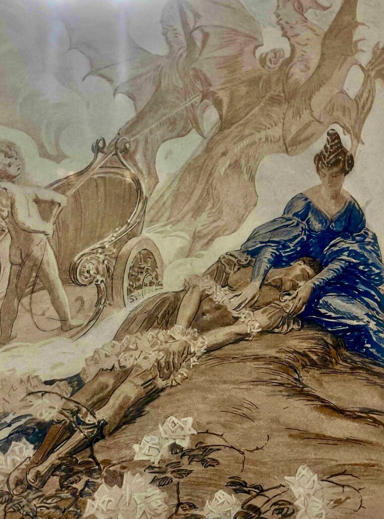 La figure de la magicienne nommée successivement Circé, Armide ou encore Alcina, illustre un symbole fort de l’époque baroque et des poèmes épiques alors très en vogue. Le tableau du jardin enchanté ainsi que celui du banquet de la Magicienne dégagent tout particulièrement une force visuelle. Durant la Renaissance, l’art du banquet combine à la fois le goût du théâtre et de la musique avec celui de la table. Les banquets étaient organisés autour d’un thème mythologique et d’un lieu métamorphosé par les enchantements d’une magicienne. Le banquet de mariage d’Alphonse II avec Barbara d’Autriche au Palais des Diamants de Ferrare (1565) constitue un bel exemple d’enchantement visuel.